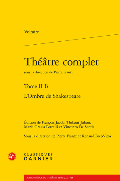 Voltaire, Théâtre complet. Tomes II A et B. L’Ombre de Shakespeare, Paris, Classiques Garnier, 2025.